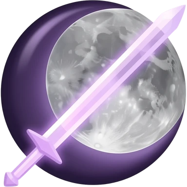Glowing dark purple detailed crescent moon with an elegant detailed glowing transparent sword, emoji style. Soft violet and pink glow, minimal clean design, smooth edges, subtle lighting, centered, high contrast, emoji