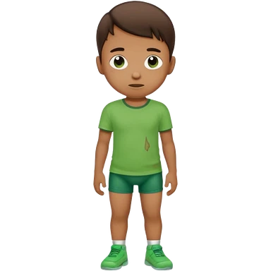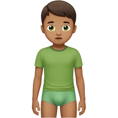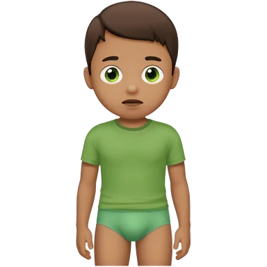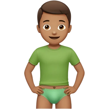 A kid wearing a poopy underwear with a green t-shirt emoji