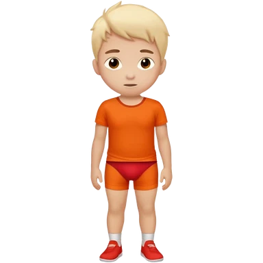 A kid wearing a red pooped underwear with a orange t-shirt looking back emoji