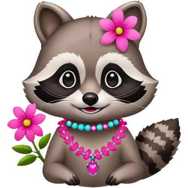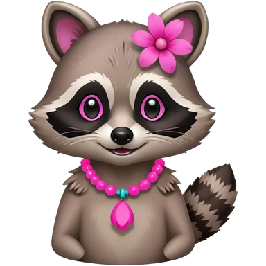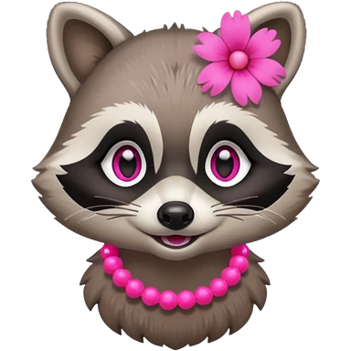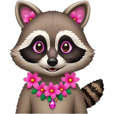 A playful raccoon wearing a neon-pink flower necklace, looking festive. emoji