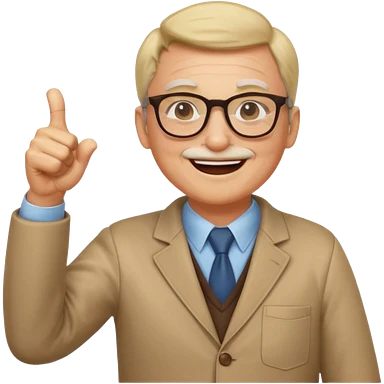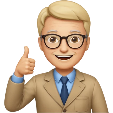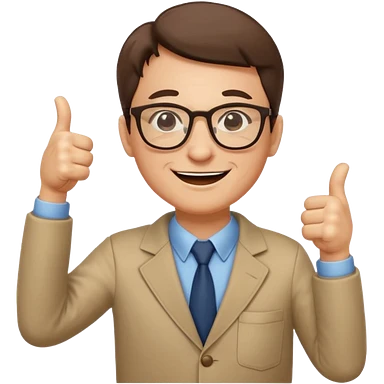 un PROFESOR que este parado con sus lentes guiñando el ojo y CON LAS MANOS HACIA ARRIBA DANDO LIKE emoji