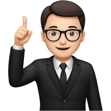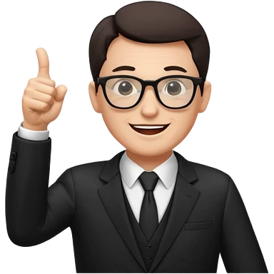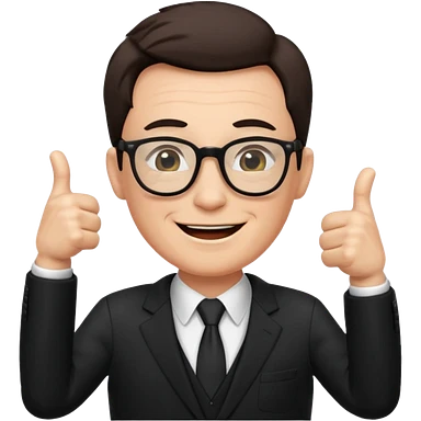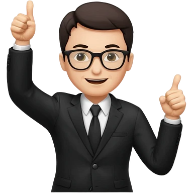 un PROFESOR con terno negro que este parado con sus lentes guiñando el ojo y CON LAS MANOS HACIA ARRIBA DANDO LIKE emoji