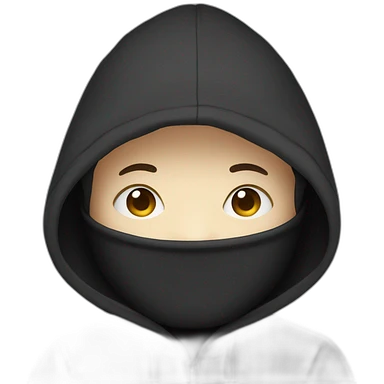 having a laptop, and in that laptop is . make that emoji background is black. the programmer face is hidden in shadow with a black facemask , and his laptop is face towars right and his programming in laptop display is shown emoji