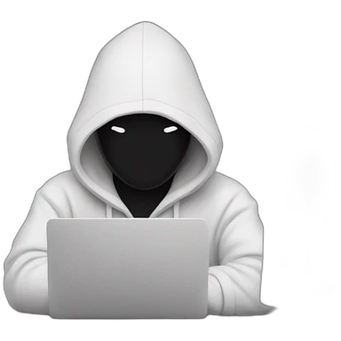 programmer with hoodie hood, no face and a laptop. Black hoodie and white face emoji