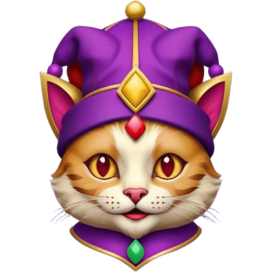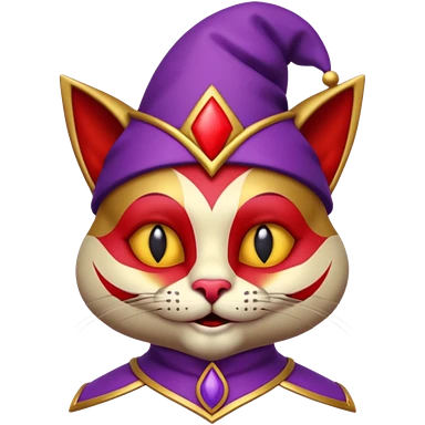 crazy colorful cute little cat jolly joker from poker, medieval, vintage, court jester, mac os icon, purple, gold and red color, half body. Squared shape as 3D mac os icon, symmetrical emoji