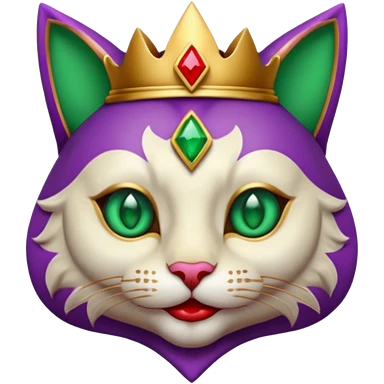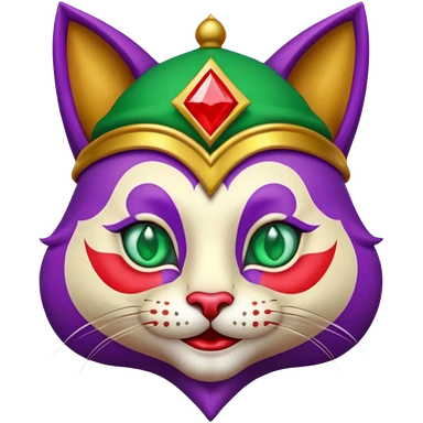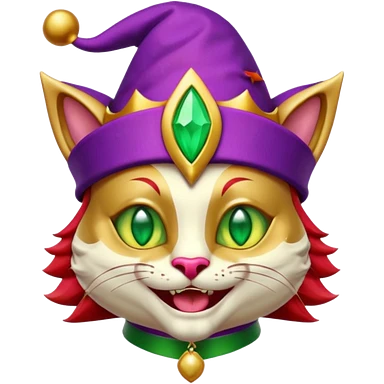 crazy colorful cute little cat jolly joker from poker, medieval, vintage, court jester, mac os icon, purple, gold and red color, half body, emerald green ice eyes, golden earrings. Squared shape as 3D mac os icon, symmetrical emoji