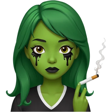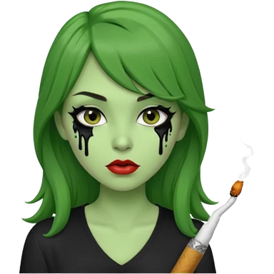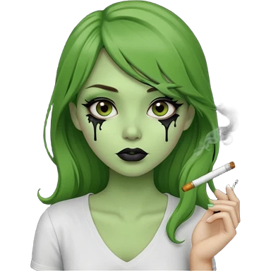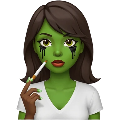 "prompt": "3D cartoon-style green-skinned girl with long brown hair and a side-swept bang. Large brown eyes with black dripping makeup, white V-neck shirt, cigarette in her mouth, dark background. Same proportions and style as the original description.",