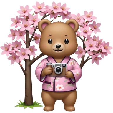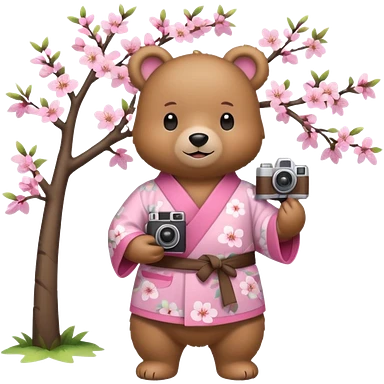 A cute light-brown bear wearing a pastel pink sakura-patterned kimono, normal balanced body ratio. Standing under a blooming sakura tree, holding a small camera and taking a picture with a happy smile. Kawaii emoji style, minimalistic clean sticker illustration, simple scenic background. emoji