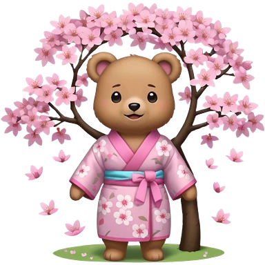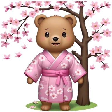 A cute light-brown bear wearing a pastel pink sakura-patterned kimono, normal balanced body ratio. Standing under a blooming sakura tree, looking up at falling pink petals with a soft amazed smile. Kawaii emoji style, minimalistic clean sticker illustration, simple scenic background. emoji
