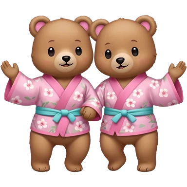 Two cute light-brown bears wearing pastel pink sakura-patterned kimonos, normal balanced body ratio. Holding hands and dancing happily together with music note icons and joyful movement lines. Kawaii emoji style, minimalistic clean sticker illustration, white background. emoji