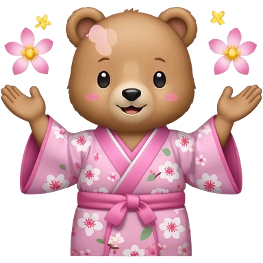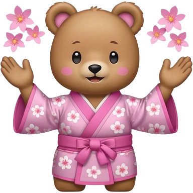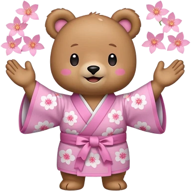 A cute light-brown bear wearing a pastel pink sakura-patterned kimono, normal balanced body ratio. Clapping hands cheerfully with a big bright smile and small spark effects around. Kawaii emoji style, minimalistic clean sticker illustration, white background. emoji