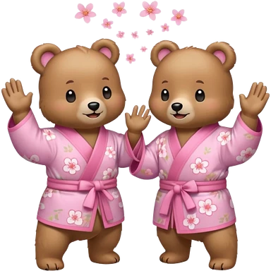 Two cute light-brown bears wearing pastel pink sakura-patterned kimonos, normal balanced body ratio. Facing each other and giving a joyful high-five with happy smiling faces and small spark effects. Kawaii emoji style, minimalistic clean sticker illustration, white background. emoji