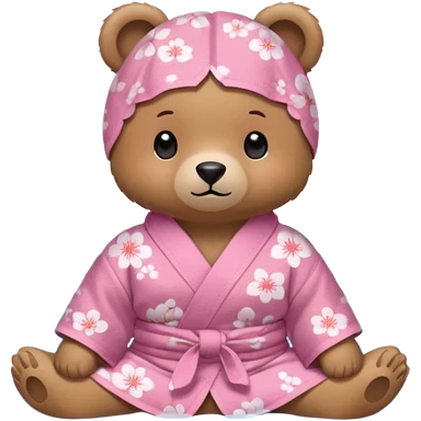 A cute light-brown bear wearing a pastel pink sakura-patterned yukata loosely, normal balanced body ratio. Relaxing in a warm hot spring with steam around, a small towel on the head, peaceful happy expression. simple scenic background with rocks. emoji
