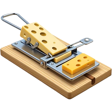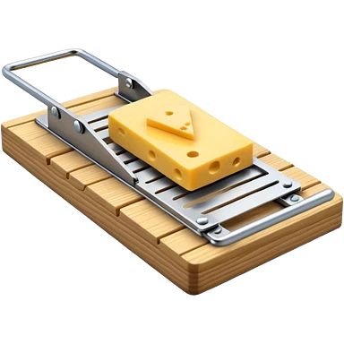 A 3D emoji in iOS emoji aesthetic style of a classic mousetrap with a wooden base and a metal spring mechanism, holding a small piece of yellow cheese, clean and detailed design, white background, glossy Apple-style rendering emoji