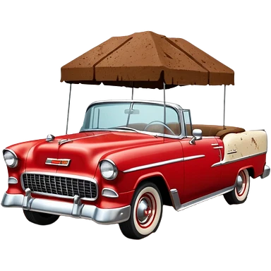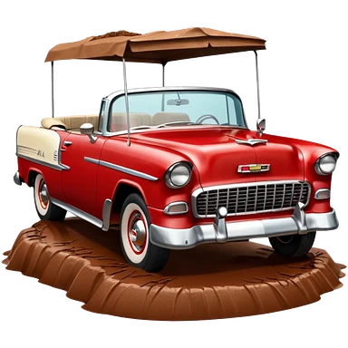 1955 Chevrolet Bel Air Convertible, Red-White color, with a bucket of brown mud pouring down on it, and the car itself is covered in brown mud on the sides that has stuck. 32x32 pixels, aspect ratio: 1:1 emoji