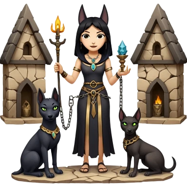 Witchy-mannered real Audrey Hepburn cleopatra Protecting silky black-haired tiny chained-slave-adorned statuette scale untamed evil-eyed Anubis dessert scenery stone-age cracked irregular dwelling emoji