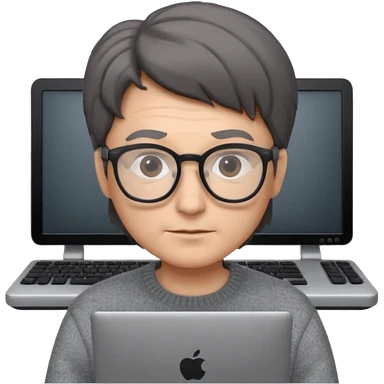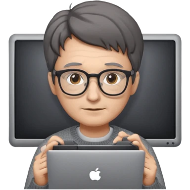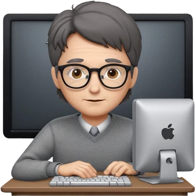 Profesor de pelo gris marrón oscuro con gafas un jersey gris y un ordenador los óleos son marrones con poca cantidad de pelo emoji