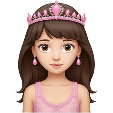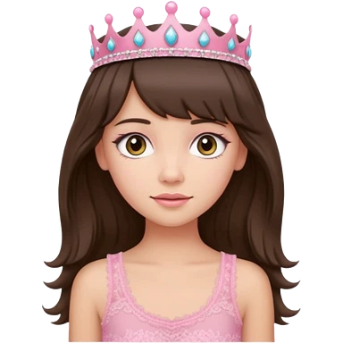 long haired brunette with curtain bangs cute pink lacy tank with a pink tiara on head, white but with a little bit of tan emoji