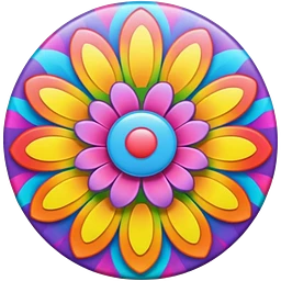 A round psychedelic colored button with a bezeled rainbow and colored hippie style flowers emoji