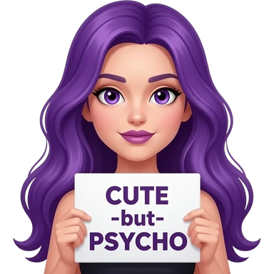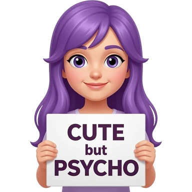 girl with long purple hair holding a CUTE but PSYCHO sign emoji
