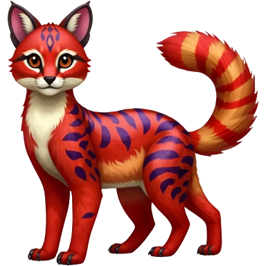 Vibrant-colored red-furred colorful painted marked patterned Asian glorious divine exotic cute cool beautiful shiny beautiful fantasy-caracal-civet-genet-sergal-vernid-Cacomistle-oncilla-animal-Fakémon-hybrid-fursona (full body) emoji