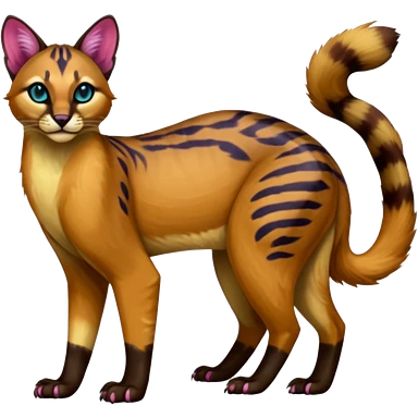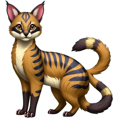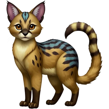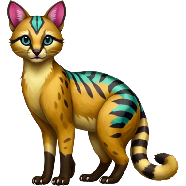 Vibrant-colored colorful painted marked patterned Asian glorious divine exotic cute cool beautiful shiny beautiful fantasy-caracal-civet-genet-sergal-vernid-Cacomistle-oncilla-animal-Fakémon-hybrid-fursona (full body) emoji