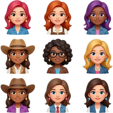 create 3d emoji of 12 women with different hair ,skin, eyes and western clothes, with small western earrings emoji