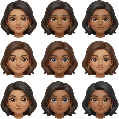 create 3d emoji of 12 indian women with different hair ,skin, eyes and western clothes, with small western earrings emoji
