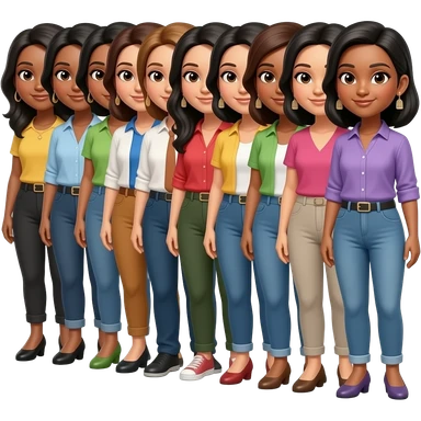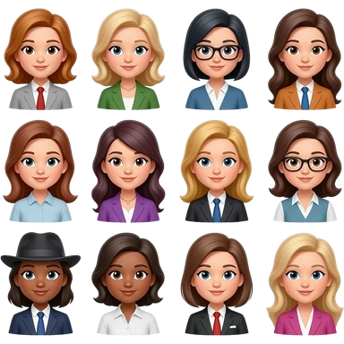 create 3d emoji of 12 classy women with different hair ,skin, eyes and western clothes emoji