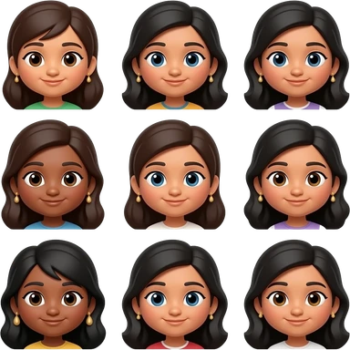 create 3d emoji of 12 indian girls with different hair ,skin and eyes emoji