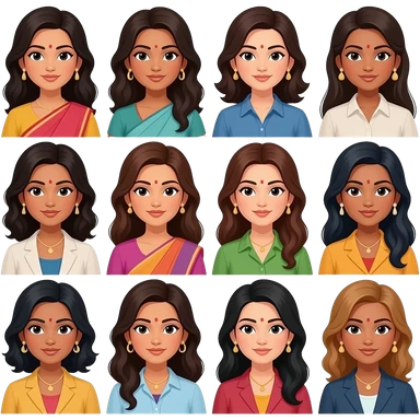 create 3d emoji of 12 indian women with different hair ,skin, eyes and western clothes emoji