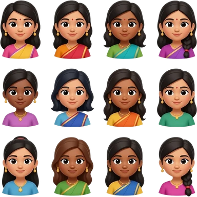 create 3d emoji of 12 indian women with different hair ,skin, eyes and clothes emoji