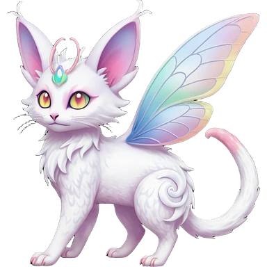 Pure-snow-White albino iridescent with pastel rainbow-gradients-color-markings with swirly patterns butterflies faerie-Noivern-Noibat-Purloin-Torracat-Lykoi-Caracal-cat-Fakemon-fusion-hybrid-creature emoji