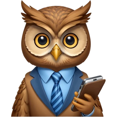 Сова в галстуке держит телефон крылом, внимательно слушает, блокнот под лапой emoji