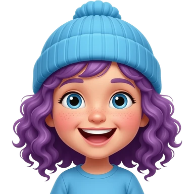 little girl with blue beanie, laughing and curly purple hair emoji