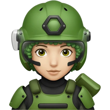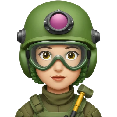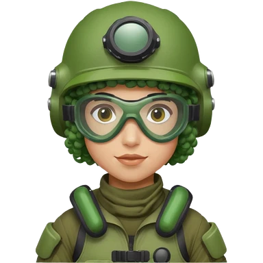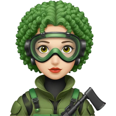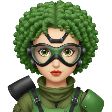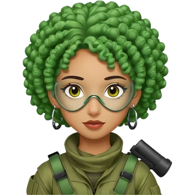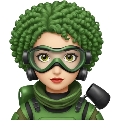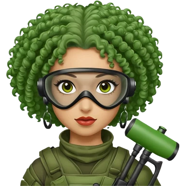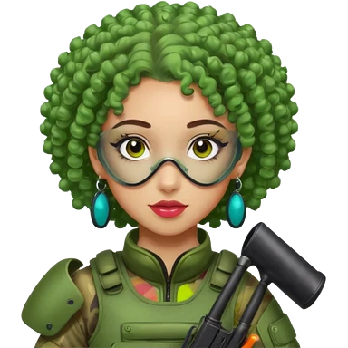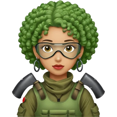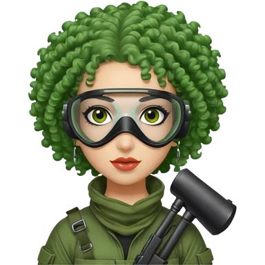 blue curly haired paintball playergirl with huge earrings, wearing paintball eye mask helmet emoji