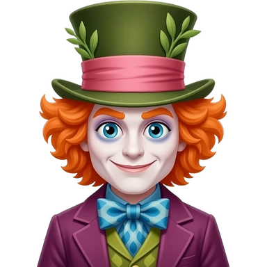 The mad hatter with pastel colors in clothing, orange hair, whimsical but kind emoji