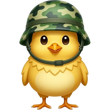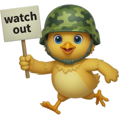 Chick with green camo army helmet on its head running with sign that says watch out emoji