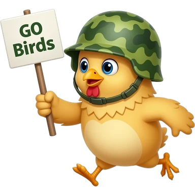 Chick with green camo army helmet on its head running with sign that says go birds emoji