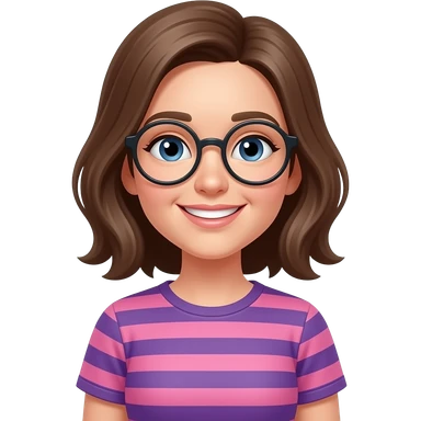 White girl with circular glasses smiling wearing a pink and purple horizontal t-shirt smiling emoji