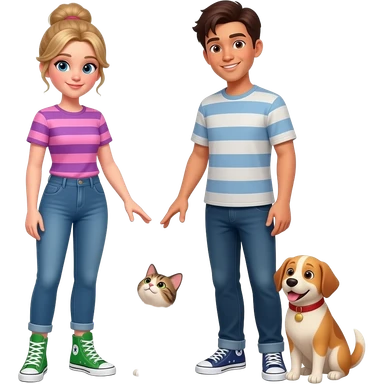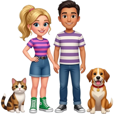 White girl with blonde brunette hair tied up wearing a pink and purple horizontally striped shirt and green converse hi tops with her Asian boyfriend with brown skin colour who is the same height as her, smiling with her cat and dog emoji