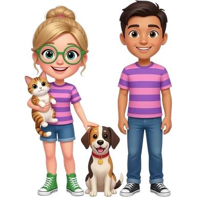 White girl with straight tied up medium brunette hair wearing green-rim circular glasses smiling wearing a pink and purple horizontal t-shirt happy with a cat and dog and Asian brown skin toned boyfriend who are the same height emoji