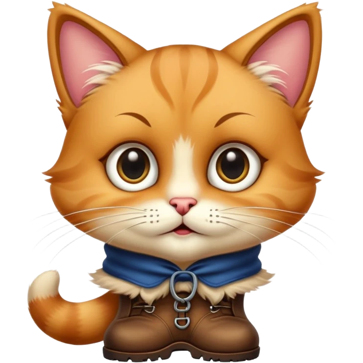 A playful orange tabby cat wearing a stylish feathered hat, big leather boots, and a confident smirk, holding a wooden flute. Inspired by Puss in Boots from Shrek, cartoonish style, vibrant colors, cute and mischievous expression. Emoji-style, simple emoji