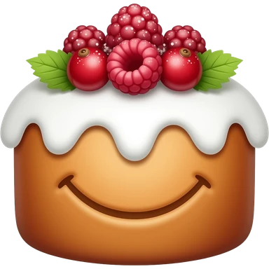 Улыбыющийся панеттоне с белой глазурью и украшением сверху из ягод малины, грозди смородины красной, зелеными лепестками, белой посыпкой emoji