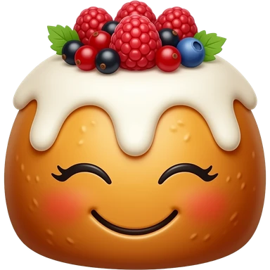 Улыбыющийся панеттоне золотистого цвета, с глазами и ресницами с белой глазурью и украшением сверху из ягодок малины, грозди смородины красной черной, черники, зелеными лепестками emoji