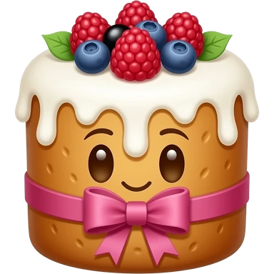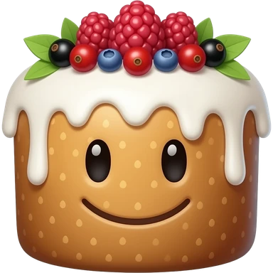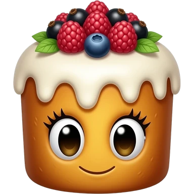 Улыбыющийся панеттоне золотистого цвета, высокий, с глазами и ресницами с белой глазурью и украшением сверху из ягодок малины, грозди смородины красной черной, черники, зелеными лепестками emoji