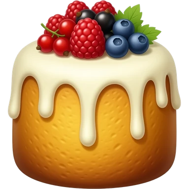 панеттоне золотистого цвета, высокий, с белой глазурью и украшением сверху из ягодок малины, грозди смородины красной черной, черники, зелеными лепестками emoji