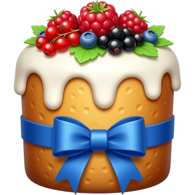 панеттоне золотистого цвета, высокий, с белой глазурью и украшением сверху из ягодок малины, грозди смородины красной черной, черники, зелеными лепестками, с голубой ленточкой emoji