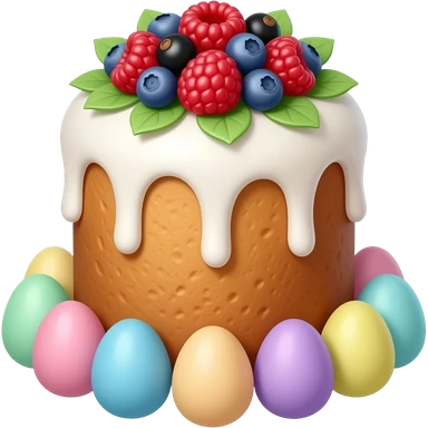панеттоне золотистого цвета, высокий, с белой глазурью и украшением сверху из ягодок малины, грозди смородины красной черной, черники, зелеными лепестками, с перепелиными яйцами пастельных тонов вокруг паннктоне emoji