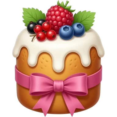 панеттоне золотистого цвета, высокий, с белой глазурью и украшением сверху из ягодок малины, грозди смородины красной черной, черники, зелеными лепестками, розовой ленточкой emoji
